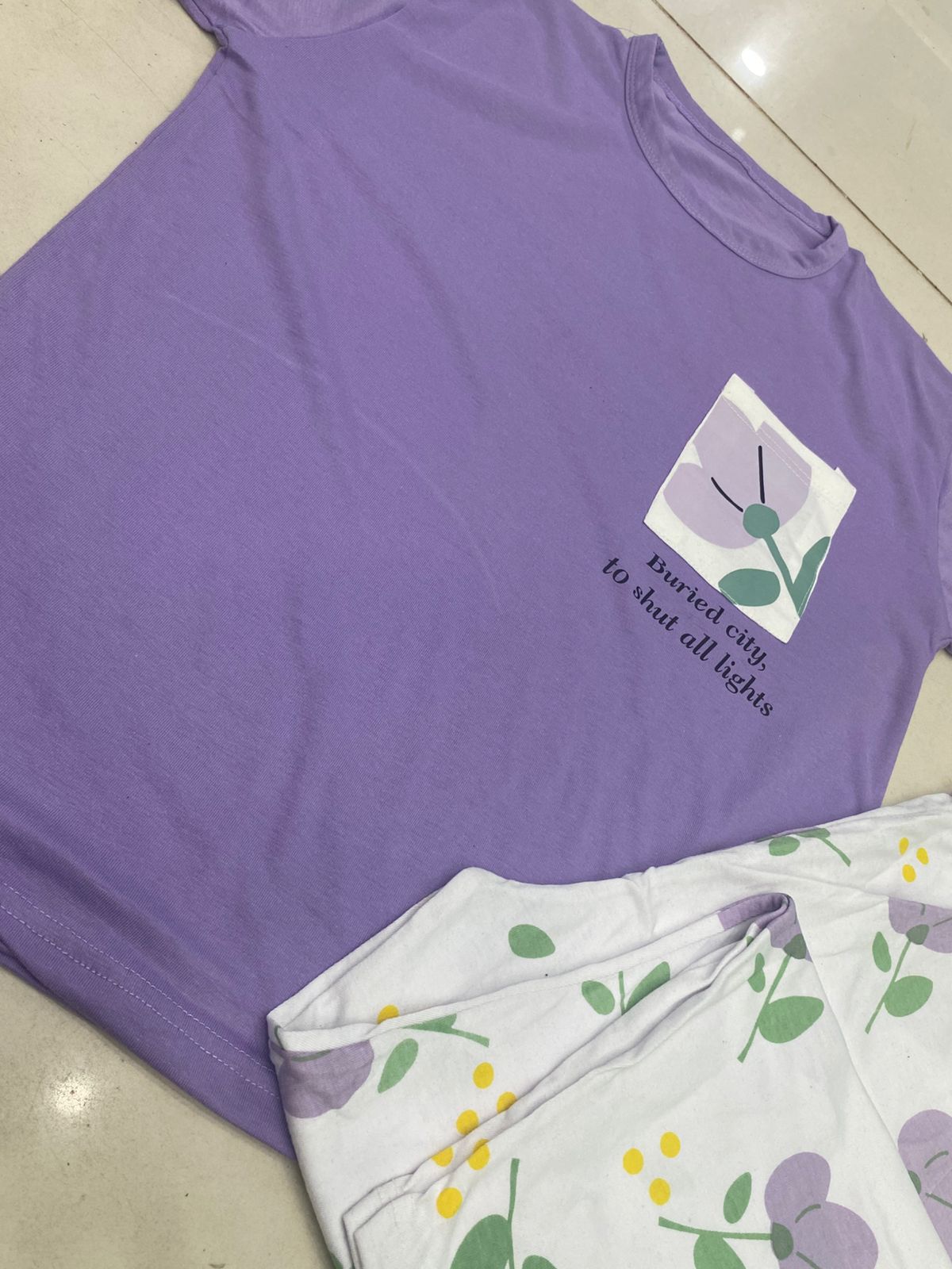 • Product Name : Lilac Flower Pocket Print Half Sleeves Printed Night Suit