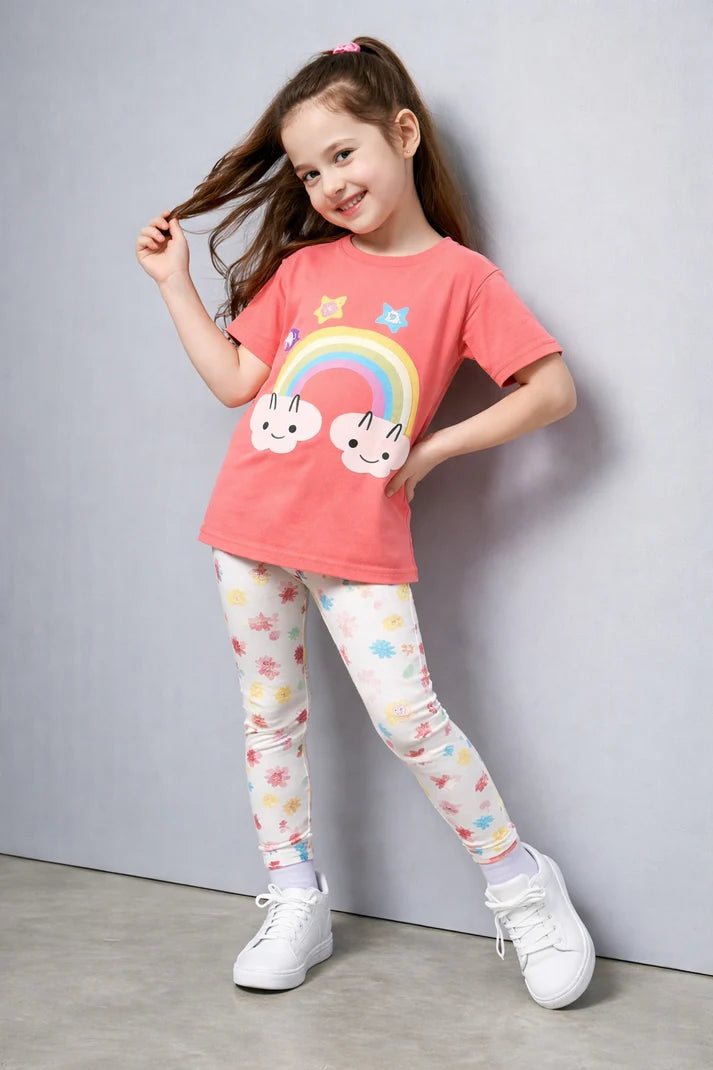 (NEW) Pink rainbow t shirt with multi STARS printed pajama kids night suit