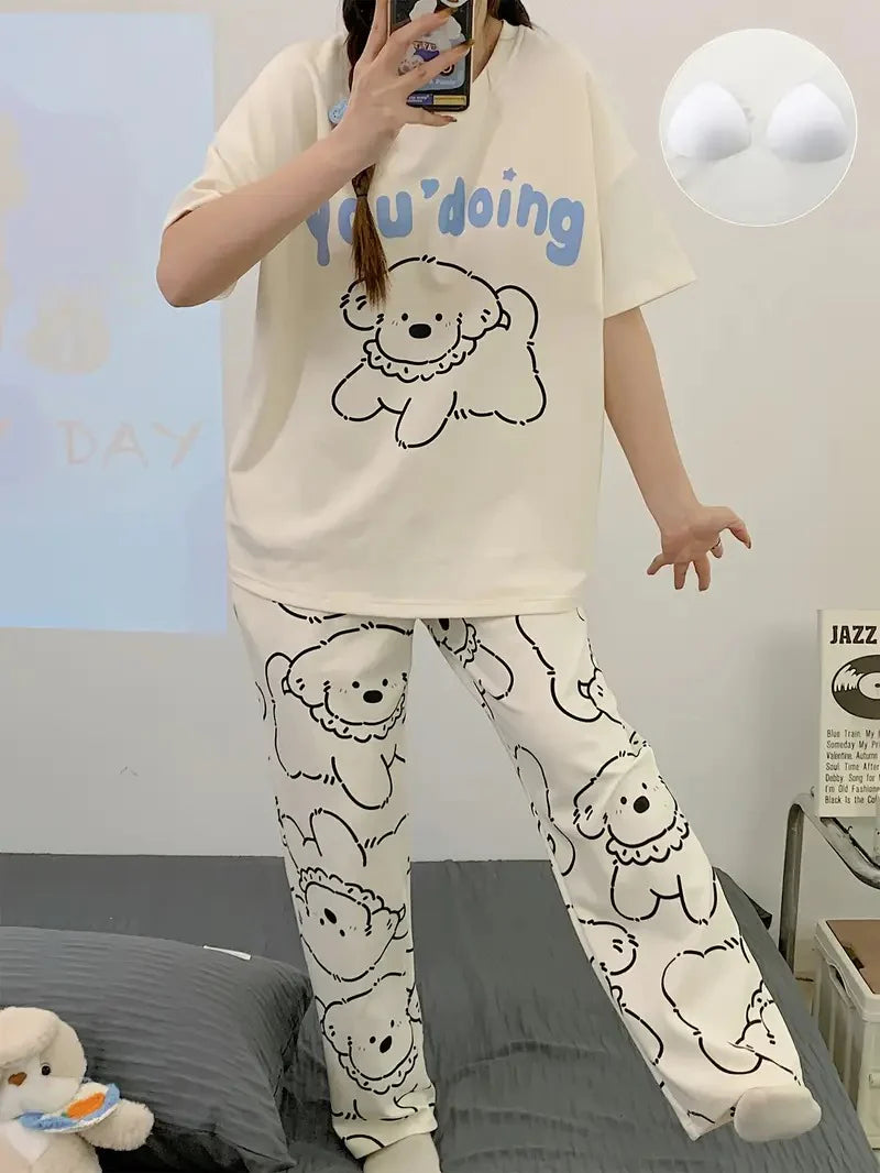 Off White Puppy Printed Half Sleeves Shirt With Puppy Printed Pajama Suit