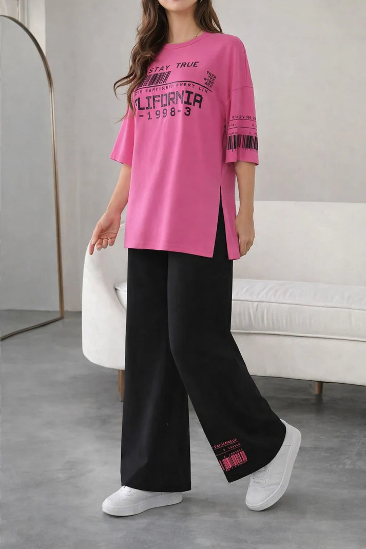 • Product Name : Shoking Pink Oversized California Printed Shirt With Plazzo Trouser